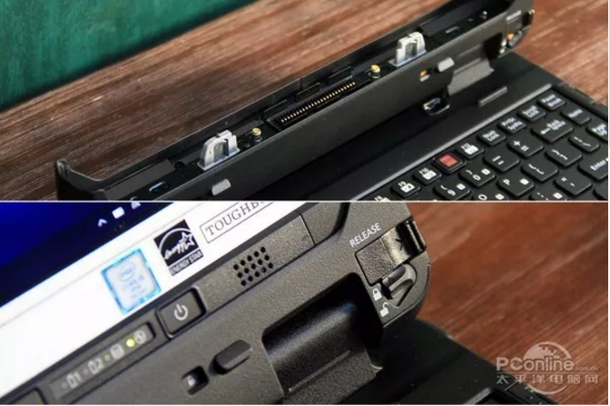 由于屏幕与键盘的结合部也采用了坚固式的设计,因此用户在使用过程中完全不必担心会发生脱落现象,这种拆装设计可以说是松下笔记本电脑所特有的,在其他产品中很难看到。同时,这样的设计也让平板与笔记本电脑的之间的切换也变得十分灵活,用户只要按照相关标识进行操作,便可轻松解锁,顺利取下屏幕作为平板电脑使用。另人佩服的是解锁后的连接处也全部是防水设计。